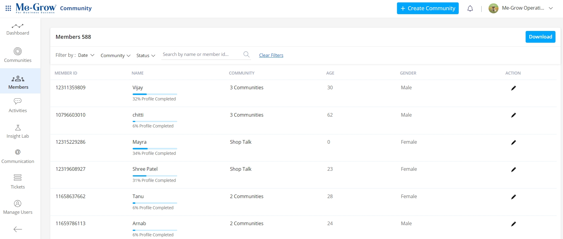 * &#x20;List provides you the member id, name, profile completion, age, gender, and action items to manage members’ profiles.